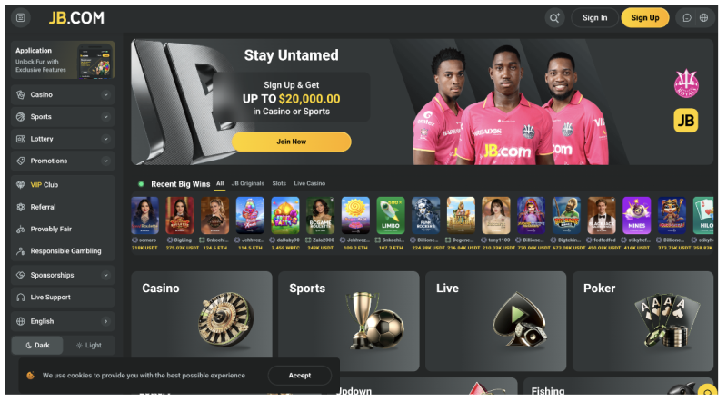 JB Casino processes crypto withdrawals in 5 to 15 minutes with a flat 0.1% fee. There are no hidden percentage charges on larger withdrawals, which makes a big difference if you are cashing out a four-figure or five-figure win. The site accepts 130 to 140+ cryptocurrencies. Verified accounts face no daily withdrawal limit, which is a huge plus if you hit a big win and want to cash out the whole thing at once. JB Casino offers 10,000+ casino games from 79 providers and a full sportsbook covering 35 to 50 sports and 15 to 17 esports. The 54 provably fair JB Originals add a unique touch you will not find anywhere else. The welcome bonus runs up to $4,000 across 4 deposits, plus 20 free bets. The 20x wagering requirement is among the lowest in the crypto casino space. JB Casino holds a Curaçao (CGA) license and features a CEO Letterbox for direct escalation of account issues, which is a nice safety net if you ever run into trouble.