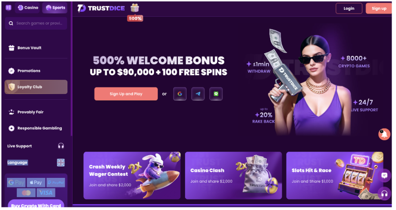 | TrustDice | • 1–10 min • 99.4% automated (no manual review) • No daily/weekly limits (monthly cap: $1M) • Risk-free first bet up to €90 • License: Curaçao |