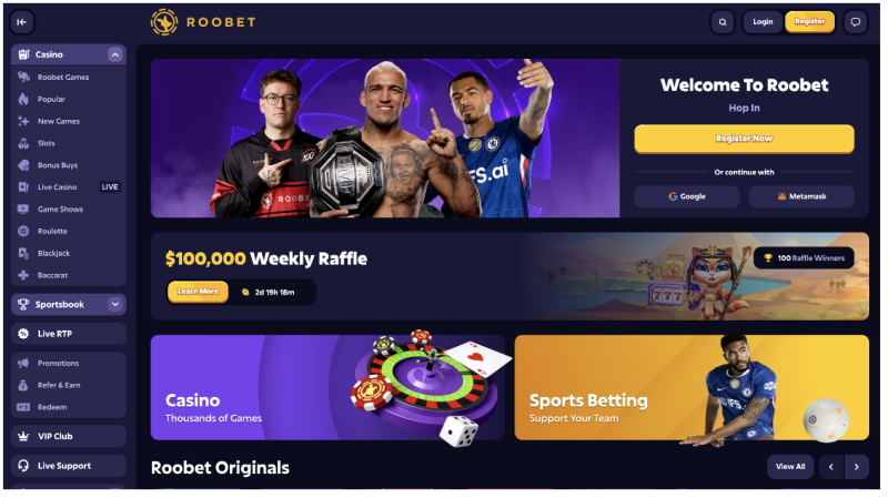 Roobet delivers instant crypto payouts with zero withdrawal fees (network fees only). ETH withdrawals tested at 8 minutes, BTC at 11 minutes in independent 2026 testing. This is the fastest verified performance in this group. Roobet accepts 7 cryptocurrencies: BTC, ETH, LTC, DOGE, XRP, USDT, and USDC. This is a crypto-only site with no fiat deposits or withdrawals. Roobet won the SiGMA Best Crypto Casino 2025 award and holds partnerships with Chelsea FC and Snoop Dogg. The site holds a Curaçao license. The game library includes 7,000+ games from 50+ providers, including 40+ Roobet exclusives. The sportsbook covers 40+ sports with 500+ markets per major event.The welcome offer is 20% cashback on losses for the first 7 days (up to $1,400 total) plus a $5 free bet. The ongoing $100K weekly raffle is open to all active players.