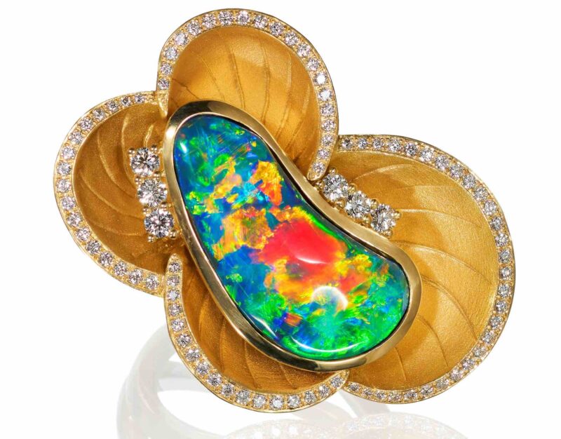 Curated by GemGenève Director Mathieu Dekeukelaire, “Flames of Opal Essence” has been realized with support from the Geneva Museum of Art and History, Piaget, A.Win Siu, Chris Price Opals, Emil Weis Opals, Ernst Färber, the Faerber Collection, Imagem, Kreis Jewellery and Boris Chauviré of GeoGems. Chauviré, who holds a PhD in mineralogy, lends his scientific expertise to the exploration of opals.